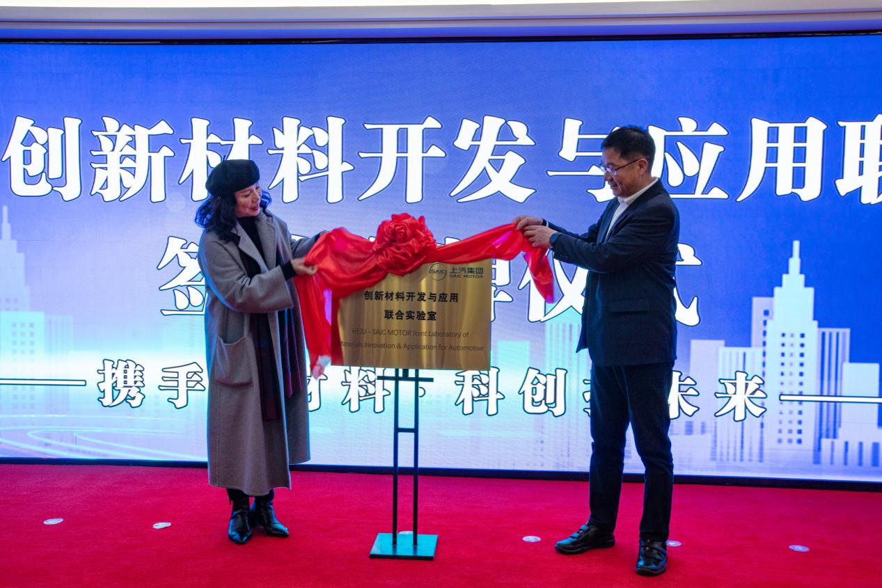 活動中,上汽集團中心實驗室總監(jiān)閔良與與合聚集團名譽董事長方琳共同為合聚—上汽創(chuàng)新材料開發(fā)與應(yīng)用聯(lián)合實驗室揭牌,并互贈禮物。